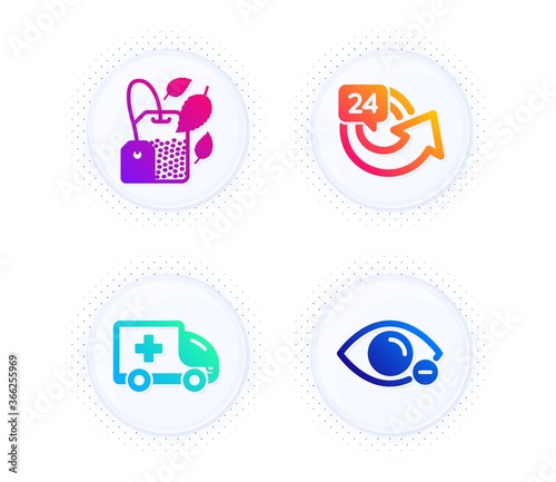 Ambulance emergency, Mint bag and 24 hours icons simple set. Button with halftone dots. Myopia sign. Medical transport, Mentha tea, Repeat. Eye vision. Medical set. Vector