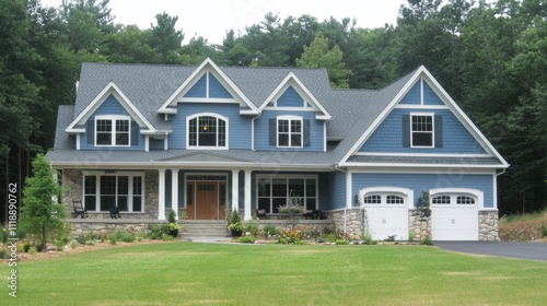 American Dream Home Blue Two-Story Suburban House with Stone Accents and Three-Car Garage