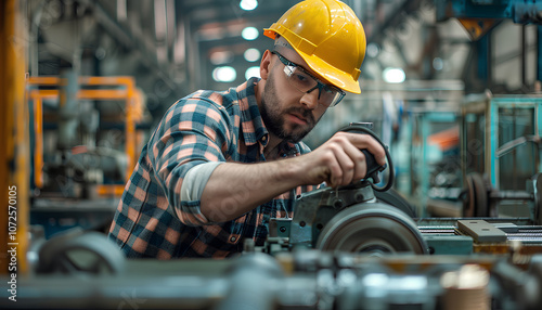 american factory male worker. Engineer man worker in plant production drilling at machine in smart factory wearing yellow hard hat safety first at mechanic factory