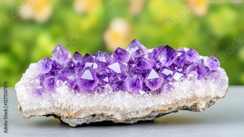 Amethyst cluster on grey surface, blurred garden background, nature photography, spiritual use
