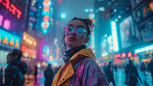 Amidst a bustling cityscape at night, a model stands illuminated by the neon lights, their futuristic outfit reflecting the vibrancy around them, showcasing modern urban couture