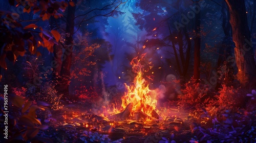 Amidst the ancient woods, a mystical bonfire blazes with ethereal hues, casting a mesmerizing glow.3