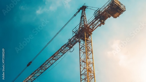 Amidst the backdrop of a brilliant blue sky, an industrial crane at a construction site meticulously orchestrates the lifting and placing of building materials.