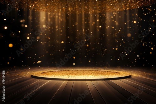 Amidst the darkness of a black background, a wooden stage showcases a podium, complemented by floating golden particles, evoking a festive and celebratory aura. Created with generative AI tools