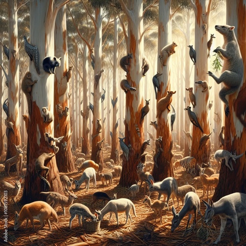 Among eucalyptus trees animals gather to celebrate the aromatic