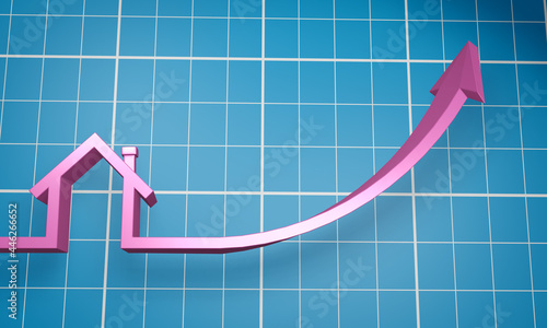 An 3D illustration of a house icon in an upward direction. An positive upward trend in real estate price. (3D rendering).