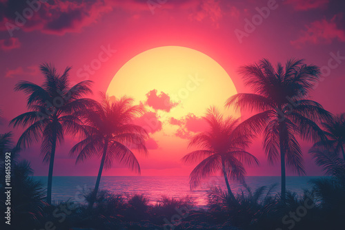An 80s-inspired pastel gradient disk in the backdrop, with slender palm silhouettes and faint horizon lines,