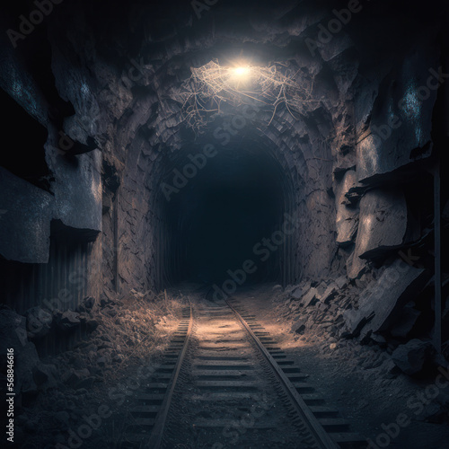 An abandoned mine's tunnel with rusty rail tracks, leading into the unknown, creating a spooky atmosphere. Generative AI illustration