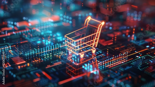 An abstract 3D render of a holographic shopping cart icon surrounded by glowing code and futuristic elements, representing the digital infrastructure of online shopping platforms in the future.
