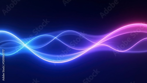 An abstract background featuring curved waves of light that transition from blue to purple.