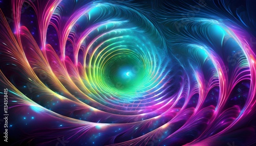 An abstract background fractal pattern resembling a digital universe, with luminous elements in neon