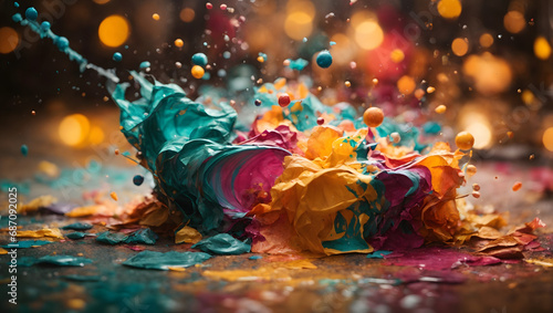 An abstract background resembling splatters of paint and bokeh lights merging in a vibrant and colorful composition, presented in vintage tones for an artistic and timeless appeal.