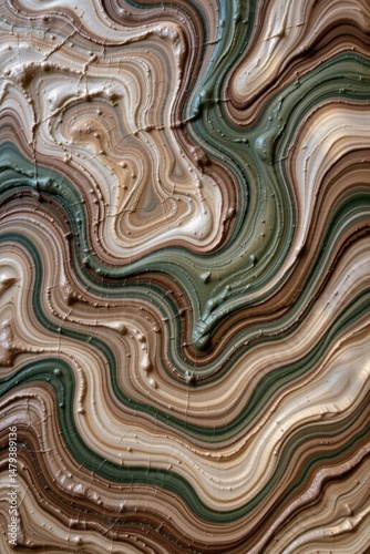 An abstract close-up shows swirling layers of earthy colors resembling a topographical map or sediment deposits formed over time with a textured surface.