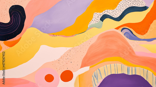 An abstract colourful background made up of a variety of shapes such as circles, lines, and curves. Black, pink, yellow, blue, and orange hues. Playful and fun mood.