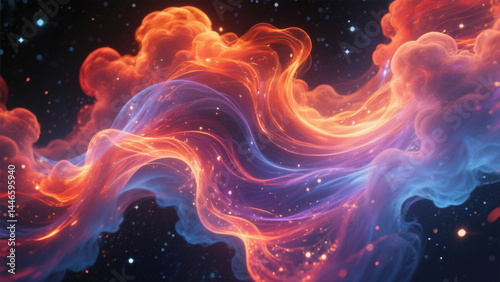 An abstract composition featuring vibrant, swirling clouds of energy in a cosmic setting.