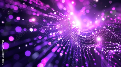 An abstract depiction of flowing digital waves in vibrant purple hues. The image features light particles and dynamic lines, creating a sense of motion and energy, perfect for conveying futuristic or