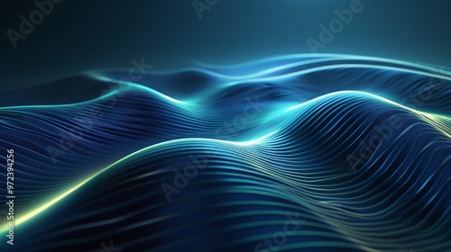 An abstract depiction of flowing waves in blue and teal hues, creating a serene and futuristic atmosphere.