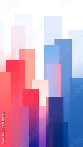 An abstract design showcasing overlapping rectangular shapes in vibrant shades of red, pink, blue, and purple, arranged like a modern artistic interpretation of a city skyline