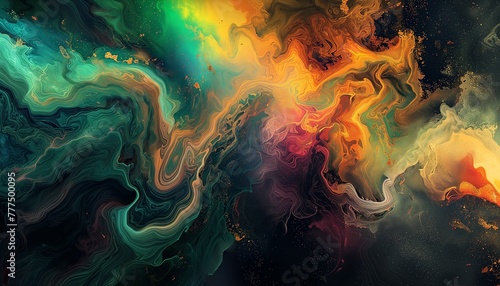 an abstract design with large color liquid dyes spilling and mixing together in a splash onto the canvas