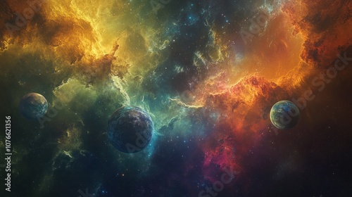 An abstract digital artwork depicting planets aligned in a surreal cosmic arrangement with swirling nebulae