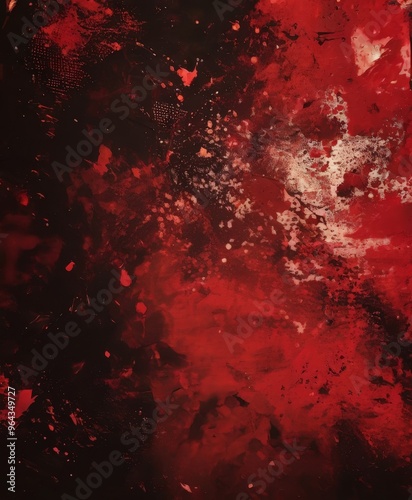 an abstract digital artwork featuring a dark red background with splatters, splotches, and splotches of white and black, creating a dynamic and textured composition.