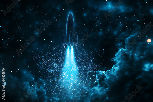 An abstract digital background banner featuring a rocket, highlighted by connecting data points in blue and black colors. The design showcases a futuristic and technological theme
