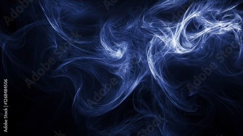 An abstract, digital background with dark tones, featuring swirling shapes and glowing highlights. The design showcases intricate patterns of light in shades of deep indigo against a black space, crea