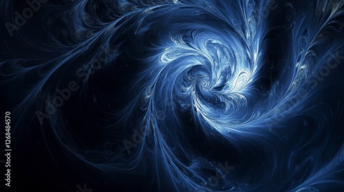 An abstract, digital background with dark tones, featuring swirling shapes and glowing highlights. The design showcases intricate patterns of light in shades of deep indigo against a black space, crea