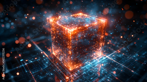 An abstract digital cube glows with interconnected data streams. Use it for tech presentations visualizations or futuristic design backdrops