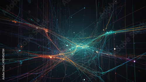An abstract digital design featuring vibrant, colorful lines and dots interconnected against a dark background, suggesting a dynamic network or flow of information.