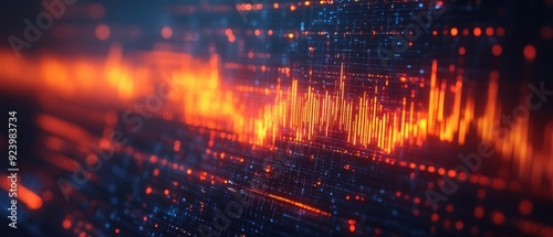 An abstract digital visualization of sound waves, exhibiting vibrant orange and blue colors, symbolizing data and audio frequencies in a futuristic setting