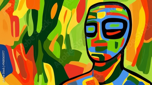 An abstract figure stands out in a burst of vivid playful colors and patterns