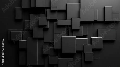 An abstract geometric composition featuring 3D-rendered blocks set against a black background.
