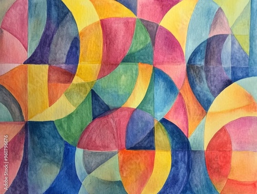 An abstract geometric watercolor painting featuring overlapping and intersecting colorful shapes, including circles and semi-circles, with a vibrant and textured appearance.