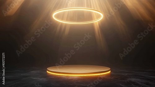 An abstract golden platform with a glowing neon ring hovering above, set against a dark background with light beams.