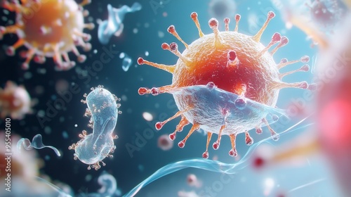 An abstract illustration depicting various colorful virus cells in a vibrant microscopical setting. The image symbolizes the complex nature of viruses, the importance of research, and the beauty of sc