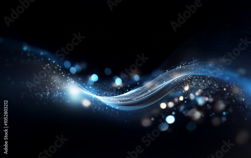 An abstract image featuring a blue wave with glowing particles against a black background with blurred bokeh lights.