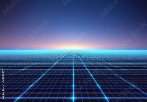 An abstract image with a deep-blue star-filled sky background and a glowing blue grid plane composed of lines and light points, evoking technology and futurism.