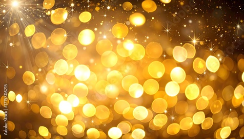 An abstract, luminous composition bursting with golden bokeh effects, light rays, and twinkling stars, creating a festive and celebratory background