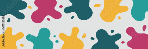 An abstract pattern featuring colorful paint splatters in teal, yellow, and pink on a white background