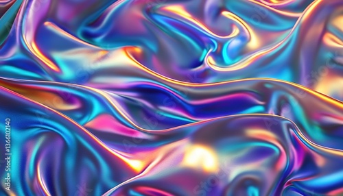 An abstract rainbow-colored satin fabric with flowing purple, blue, pink, and orange gradients, smooth ripples and reflective effects, futuristic and dreamy atmosphere