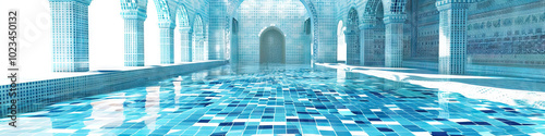 An abstract rendering of a Turkish bathhouse's intricate mosaic tiles, dancing with shades of blue and white.