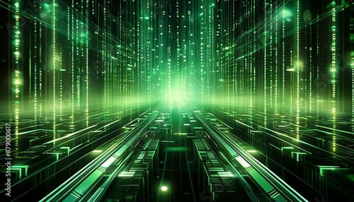 An abstract representation of a digital matrix with cascading numbers and symbols, reminiscent of the Matrix movie, on a black and green background