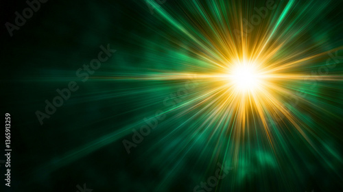 An abstract representation of asymmetric green light burst, with beautiful rays of light illuminating a dark green background, symbolizing energy, movement, and contrast between calm and intensity.