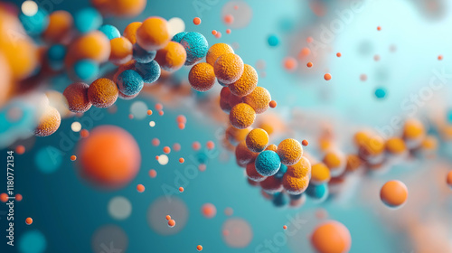 An abstract representation of DNA strands with colorful spheres, illustrating molecular biology and genetic structures in a vibrant, scientific context.