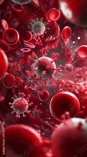 An abstract view of red blood cells and viruses highlighting the microscopic world of pathogens in the bloodstream.