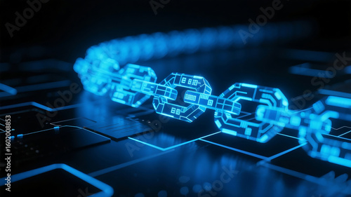 An abstract visualization of a secure blockchain, showing interconnected, glowing blue blocks of data forming an unbreakable digital chain, representing decentralized and secure technology