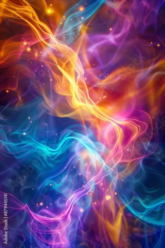 An abstract visualization of quantum entanglement, with swirling, intertwined particles and waves of light in a spectrum of bright, contrasting colors.
