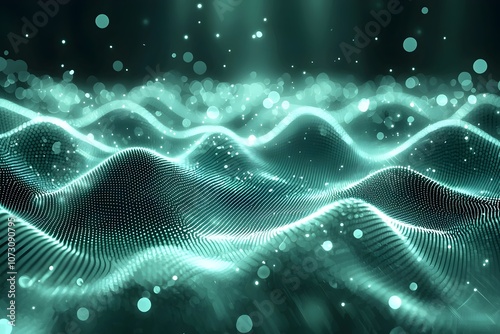 An abstract wave of luminous teal particles creates a mesmerizing fluid effect, evoking a sense of depth and movement in a digital landscape.