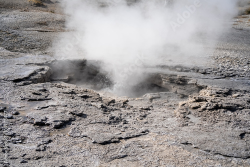 an active geyser spring with an intermittent discharge of water ejected turbulently and accompanied by steam
